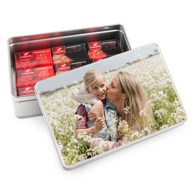 Verwen met een stijlvol cadeaublik Côte d’Or, gepersonaliseerd met een unieke foto.