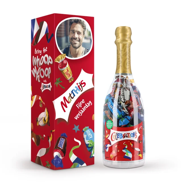 Geef een feestelijk cadeau met een persoonlijke touch, zoals een Celebrations doos met foto en naam.