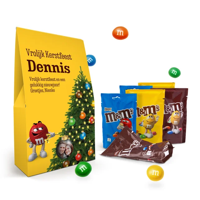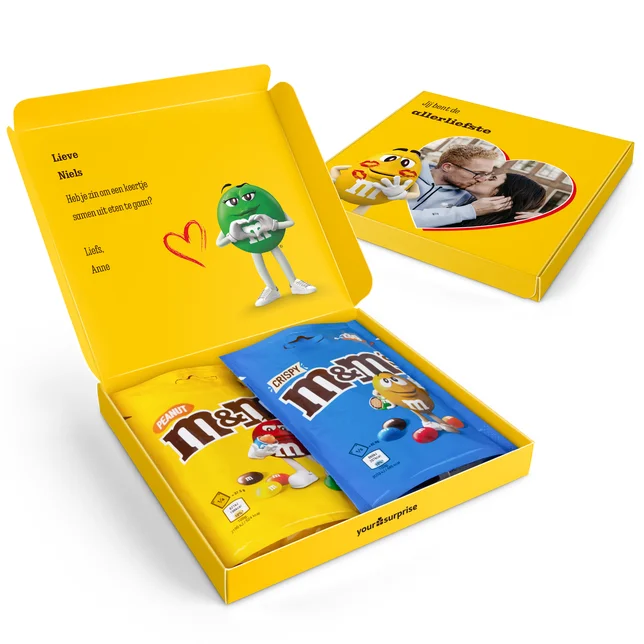 Verras met een M&M cadeaupakket, gepersonaliseerd met een unieke foto en kleurrijke snoepjes.