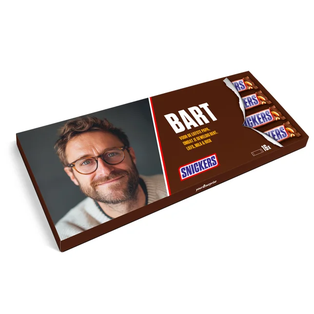 Geef een grote Snickers reep, bedrukt met een persoonlijke foto voor een uniek cadeau.