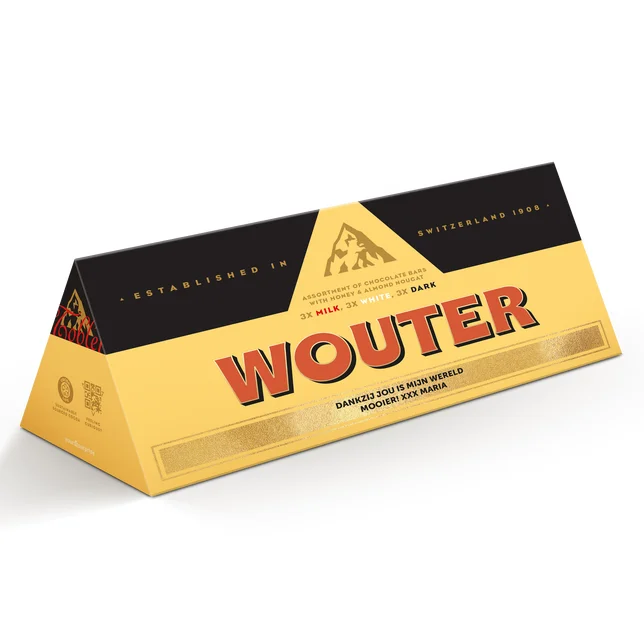 Personaliseer de iconische Toblerone reep met een naam of boodschap voor een uniek chocoladecadeau.
