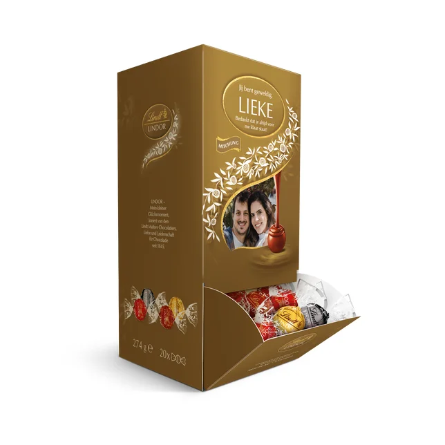 Geef luxe Lindt chocolaatjes in een dispenser met een gepersonaliseerde naam en foto.